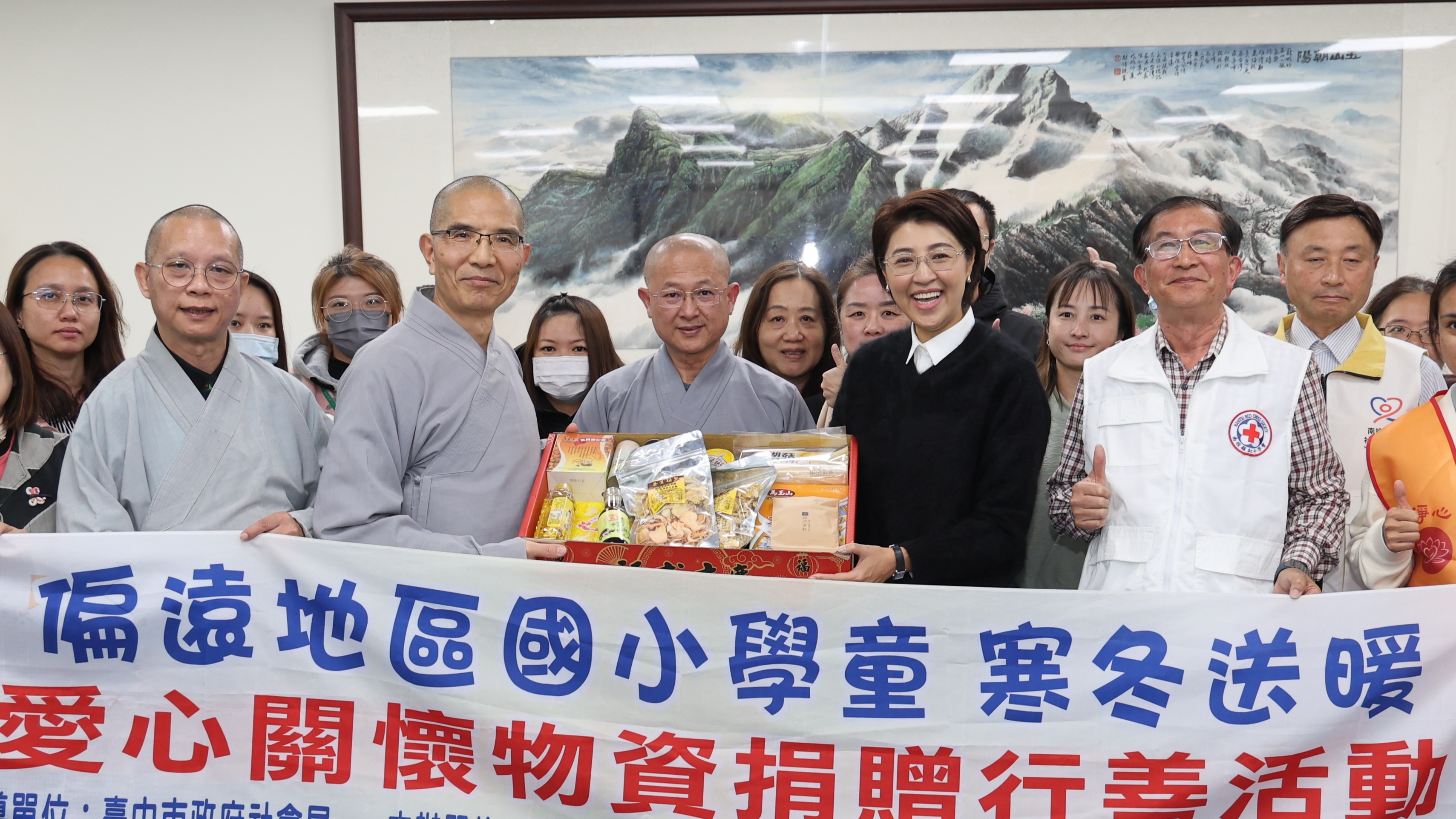 寒冬送暖!臺灣靈巖山寺暨財團法人佛教淨心慈善基金會,連續3年慨捐急難救助金給南投縣政府,今年更特別針對縣內低收及中低收入戶獨居長者,捐贈320份愛心食物箱,22日由縣長許淑華及12個獨居老人服務單位代表受贈,許縣長衷心感謝佛門慈悲持續協助縣府守護弱勢家庭及獨居長輩的愛心。