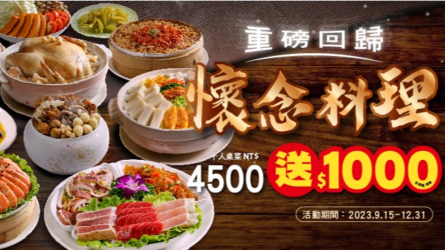 活動期間9月15日至12月31日,「懷念美好料理」3,500元+10%送500元次回抵用券,「懷念幸福料理」4,500元+10%送1,000元次回抵用券,每桌限抵一張,輕鬆就能享用高CP值美味台菜。