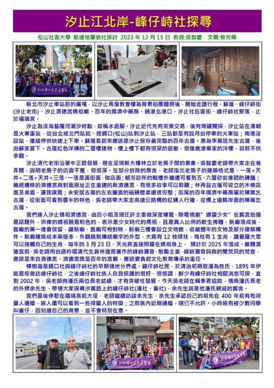 🔺基隆河灘音~峰仔峙社走讀-成果紀錄(文:20231215汐止江北岸-峰仔峙社探尋 蔡芳曄)(文:吳智慶老師、松山文史導覽隊提供)