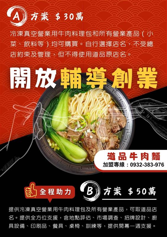 2. 免經驗、免廚師: 創業者無需具備餐飲經驗或聘請專業廚師。道品牛肉麵提供標準化的製作流程和秘製配方,使得任何人都能輕鬆上手。
