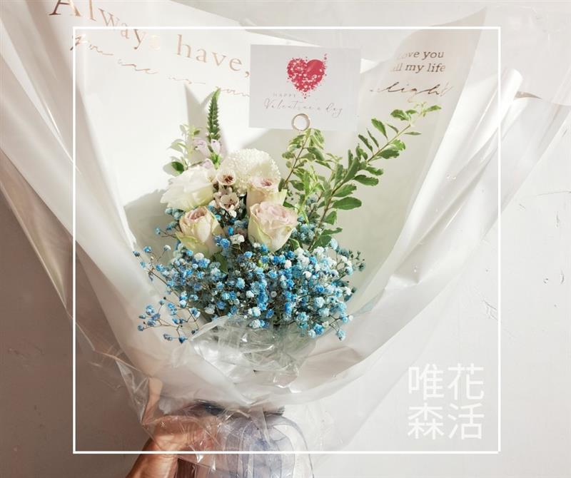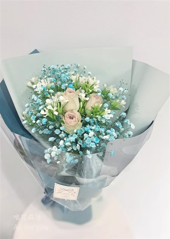 ▲搭配討人喜愛的藍色調滿天星鮮花玫瑰花禮