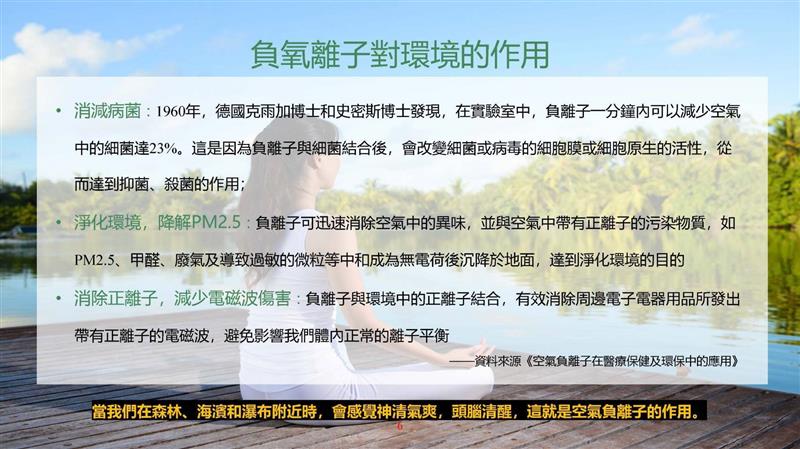 負離子被稱作空氣的維生素,不但可以消除【自由基】、清潔血管中的雜質,還能維持血液弱鹼性,增強細胞膜的通透性、調節自主神經系統及人體自癒力!