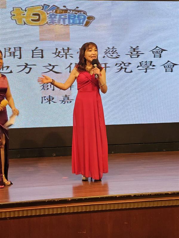 ▲拍新聞自傳媒·網際互利平臺的執行長洪明雪,在台上介紹拍新聞自傳媒網際互利平台以及感謝各位特邀嘉賓。(圖片由拍新聞慈善會大會提供)