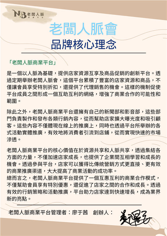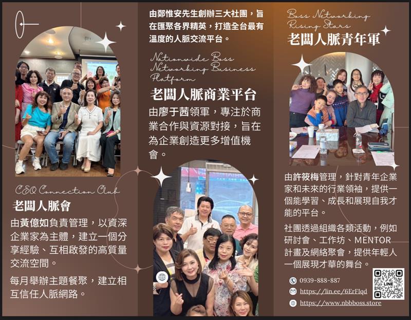 在「老闆人脈會」、「NBB老闆人脈商業平台」和「老闆人脈青年軍」這三大平台中,每一位夥伴都需具備為組織和社會付出的精神。他們不僅致力於自身的商業發展,更關注社會福祉,願意通過個人努力和資源幫助他人。這種利他主義的理念貫穿於平台的每一個角落,吸引並凝聚了一群志同道合的夥伴,共同創造一個以善以愛為出發點的商業生態系統。