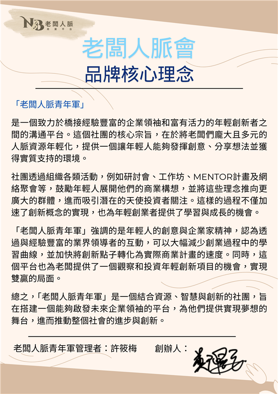 隨著「老闆人脈會」組織規模的擴大,越來越多的年輕新血加入,帶來活力、創意和才華,因此成立了「老闆人脈青年軍」。「老闆人脈青年軍」強調提供一個讓年輕人發揮創意、分享想法及施展才能的多元平台。透過舉辦各類活動,讓企業領袖和業界領導者發現這群才華橫溢的生力軍,吸引天使投資人提供資助,為年輕創業者提供學習與成長機會,並提供投資人所需的資源和企劃,創造雙贏局面。