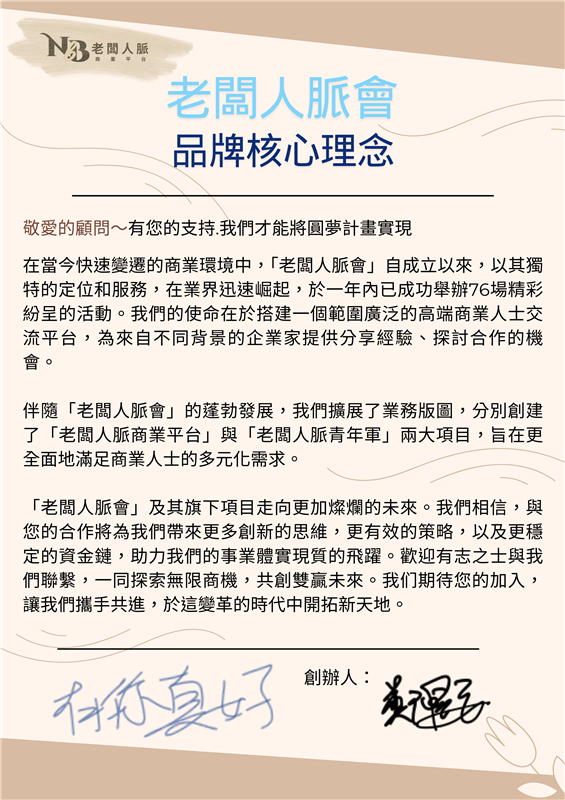 「老闆人脈會」的創立初衷,是希望幫助各行各業的企業家們結交朋友,建立廣泛的資源網絡。無論是出差到外地還是參加商業活動,企業家們都能依靠朋友之間的情誼獲得支援與幫助。