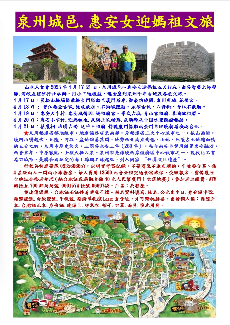 山水人文會2025年4月17-21日,泉州城邑~惠安女迎媽祖五天行程,由吳智慶老師帶隊.海峽友誼旅行社承辦,用小三通機航,進金廈到泉州千年古城及各邑文旅。