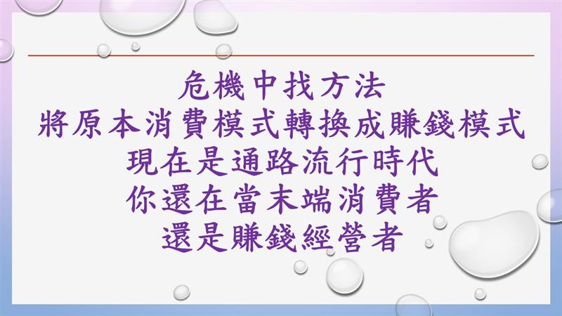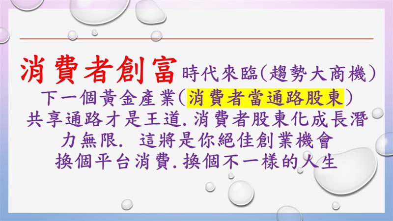 賺錢的方式很簡單~當通路股東的賺錢方式,不是找人來當消費者買商品,也不是找人來當業務員賣商品,而是找人來當通路股東,享股東分紅賺錢,這種賺錢的方式,人人都需要人人都適合。