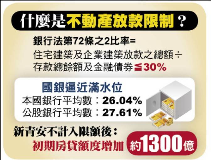 銀行承辦新青年安心貸款,自114年9月1日後的撥款,不計入銀行法第72-2條的額度,藉此釋出更多放款,解決近期的「房貸荒」。