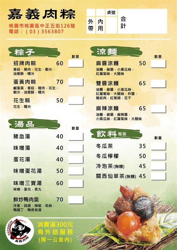 ▲台灣飄香50年傳承四代「桃園-嘉義肉粽」菜單(圖/嘉義肉粽提供)除了知名的肉粽之外,豬血湯、鴨肉羹、冬瓜茶、冬瓜檸檬...等,都是人氣款商品。涼麵也是店家的賣點之一,其中傳統麻醬涼麵口味獨特,有別於一般涼麵,雙醬涼麵更是一絕,麻醬搭配炸醬蹦出心滋味,喜歡吃辣的也可以嘗試看看四川麻辣涼麵,所有的醬料,都是店家精心研發調製,這時候再搭配一碗味增貢丸蛋花湯,畫下完美的句點!桃園嘉義肉粽保留舊時代的人情味,人氣網紅老店雋永不變的味道與精神,備受老饕喜愛與好評,更讓在地居民對於昔日的美好更加留戀。
