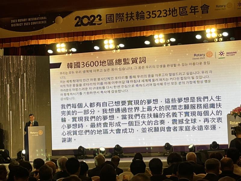 韓國3600地區總監崔寬俊致詞表示,代表國際扶輪3600地區與貴地區建立友好關係,在我們共同走上這條陌生的路時,我們國際扶輪3600地區也將與3523地區同行,成為彼此像影子一般舒適的伴侶。讓我們攜手在這兩個地區建立起愛的金字塔。我們將繼續為當地社區做出貢獻,並以我們的努力和自豪感為榮,期盼進一步加強3600地區和3523地區之間的友誼和交流。