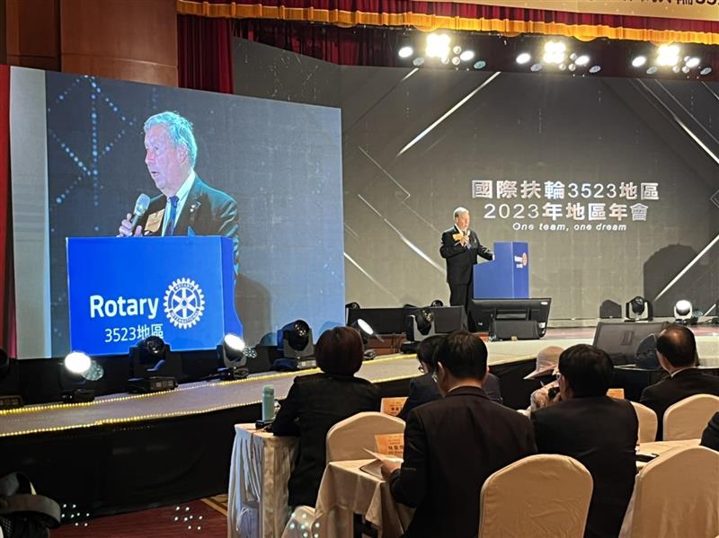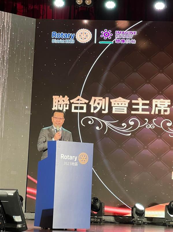▲國際扶輪3523地區聯合例會共同主席代表陳建瑜Robert社長致詞(圖/尖端奈米科技楊小萍提供)