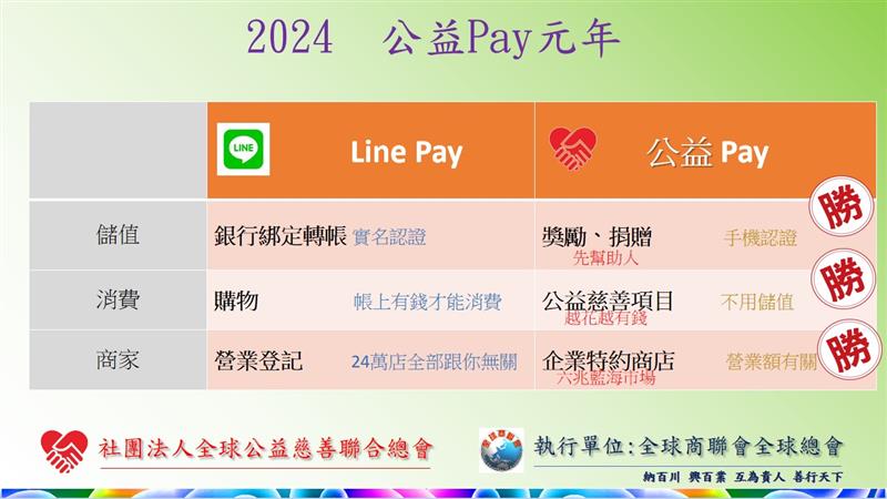 「全球商聯會全球總會」積極推動的「公益pay」成為社會矚目焦點之一,旨在協助特約商店實現財富倍增再分潤的理念,透過企業的社會責任推動公益事業的蓬勃發展。