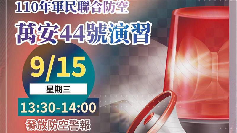 新北市110年軍民聯合防空(萬安44號)演習,訂於9月15日(星期三)13時30分至14時舉行,實施30分鐘防情傳遞及警報發放等實作演練,市民朋友聽聞警報聲時請勿驚慌,演習時所有車輛、行人不實施管制,飛機、船舶、鐵路、高速鐵、公路及捷運車輛,均照常起降、靠離與行駛。
