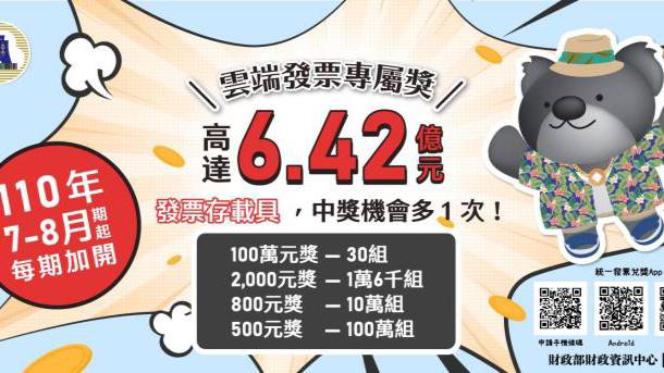 為使雲端發票融入民眾的消費習慣,財政部繼今年3~4月期加開40萬組500元雲端發票專屬獎後,下半年起,又將加開800元獎10萬組,所以9月25日統一發票開獎時,雲端發票專屬獎就有100萬元奬30組、2,000元獎1萬6,000組、800元獎10萬組及500元獎100萬組,總金額高達6.42億元。