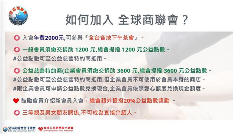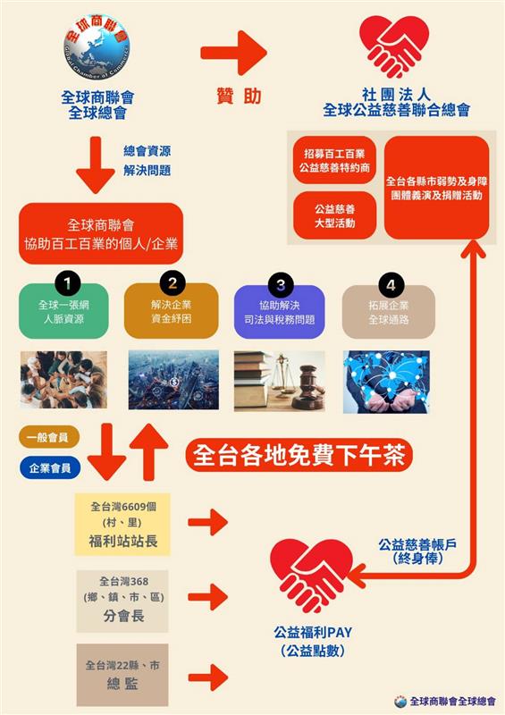 ▶「全球商聯會全球總會」:啟動全球共襄盛舉,納百川、興百業、互為貴人、善行天下!積極招募「公益慈善特約商」