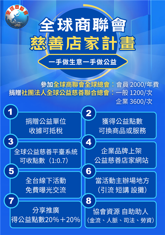 「全球商聯會全球總會」是一個結合全台各產業資源、跨界合作的非營利平台,宗旨為「全民公益、翻轉經濟」。商聯會透過「公益點數制度」,讓每一筆捐贈都能轉化為消費價值,並協助企業提升品牌形象、拓展異業合作、媒合資金與顧問資源。