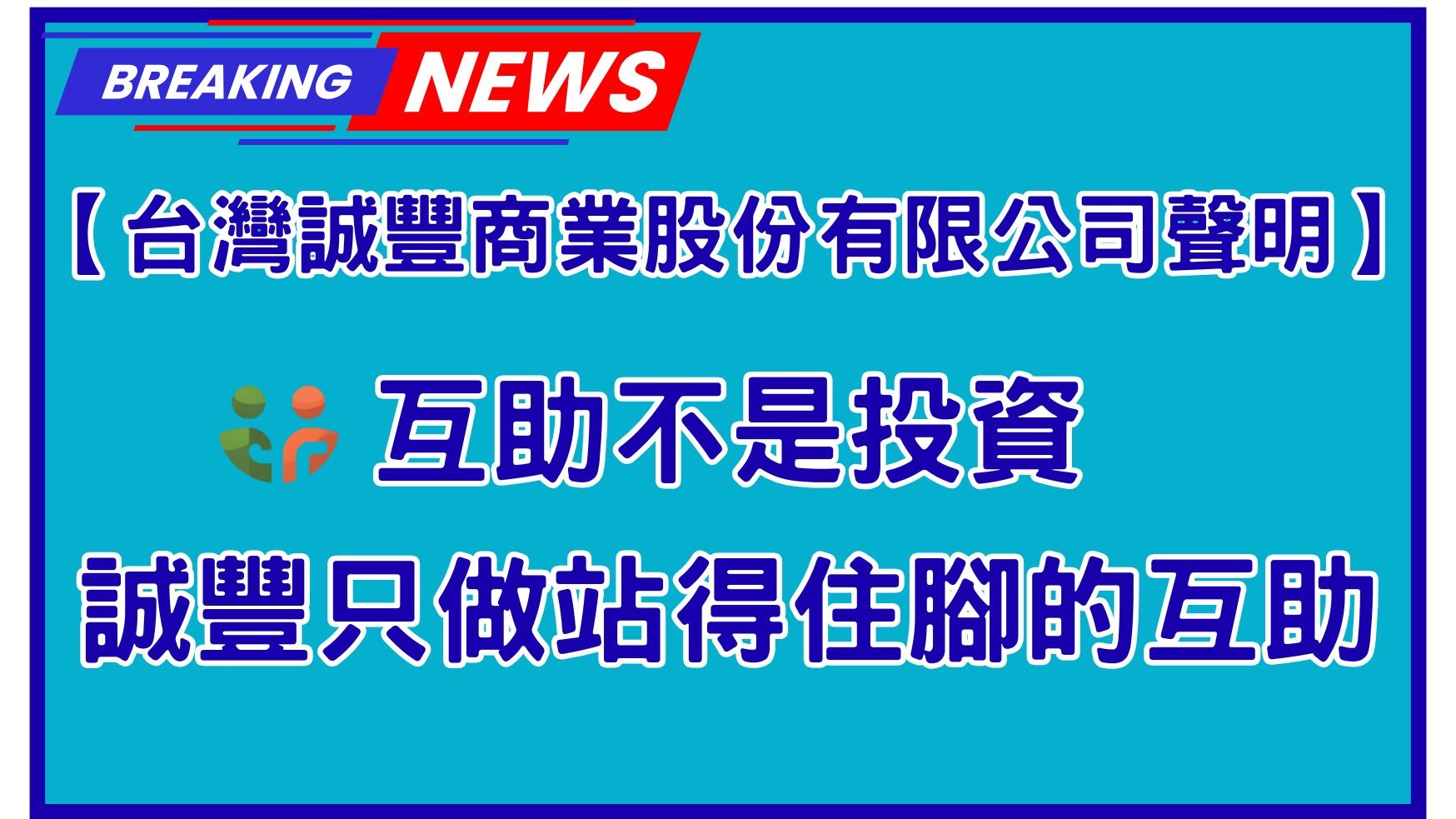 近日媒體報導部分業者涉及「假互助、真吸金」之違法案件,引發社會大眾對互助型制度的關注與疑慮。誠豐互助契約在此鄭重說明公司立場,以正視聽,並向所有會員及合作夥伴說明本公司一貫的經營原則。
