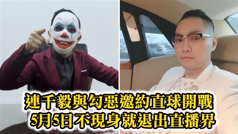 連千毅嗆聲邀約勾惡5月5日6點直球對決,大家在運動場對質,勾惡的委託人也都來,他會請經理和委託人談,滿足委託人後,剩下就是他和勾惡直接辯論,他提出兩大要求,1.勾惡一定要拿下面具;2.如果勾惡不出現,就退出YT直播界,回去當舞蹈老師。