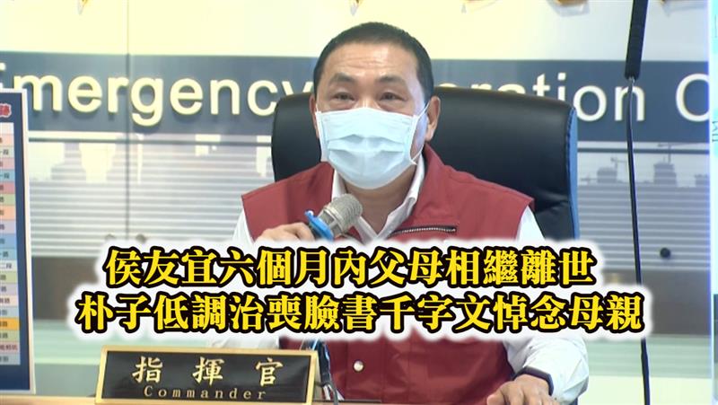 ▲侯友宜六個月內父母相繼離世 朴子低調治喪臉書千字文悼念母親(圖/擷取於侯友宜臉書)《拍新聞/網記 文字河/嘉義報導》新北市長侯友宜母親呂秀蓮23日下午逝世享耆壽90歲,今(29日)在朴子殯儀館舉行家祭,侯友宜也到場送母親最後一程,侯友宜表示, 多麼捨不得放開手中那條緊繫靈柩的長繩,只因這是此生和您在人間最後的相繫… 願我們來生再續母子緣 。