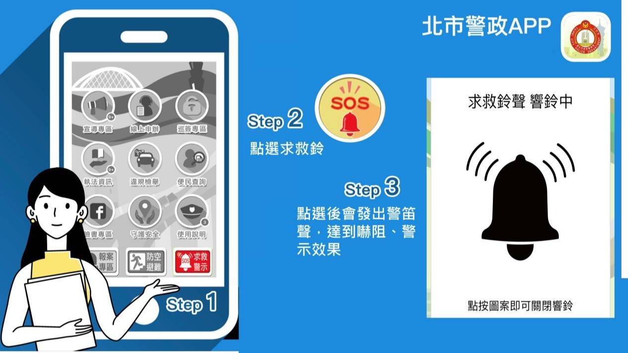 說:北市警政APP「跑馬燈」,不驚動行為人或無法出聲情況下,以警示跑馬燈方式通知周邊的人協助報案