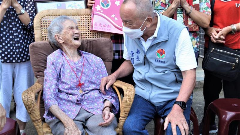 第一站是今年101歲的張松妹,徐耀昌看到老奶奶備感「熟悉」,因為縣長媽媽的名字也叫「松妹」,他希望松妹奶奶身體健康、福氣滿堂。張松妹育有5女2男,常年茹素快70年,生活簡單,生性樂觀,雖然脊椎側彎嚴重,但不願依賴輪椅,寧可自己用椅子慢慢行動,精神相當值得年輕人學習。