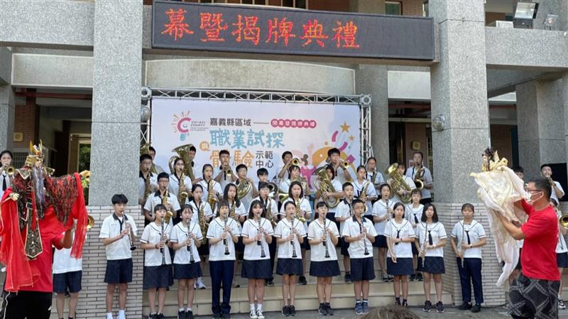 今日活動由水上國中管樂團擔任開場迎賓表演,同時結合藝術職群,典禮主持人是由職探中心藝術課程的布袋戲偶擔綱,舊時民間都是在喜慶時頒演布袋戲,透過大型木偶演出,呈現猶如MV似的劇情,帶領全場來賓一起啟動,喜迎好兆頭。