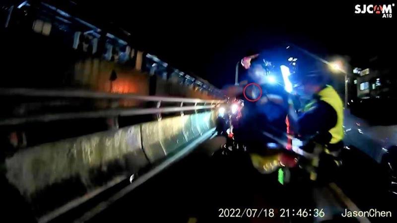 可是這一切就在員警發現吳男褲子後方臀間有異常突起物時變了,吳男開始身體扭捏不自然,雖口中同意員警拍搜褲子,卻與員警阻擋拉扯企圖遮掩,更在將近事跡敗露之際,竟突然伸出左手握住私藏之物,奮力拋向橋下,卻不知其0.2秒的狡猾滅證行為,已完整收錄在員警胸前密錄器中成為持毒鐵證,接著吳男更瘋狂脫序企圖逃逸,在場員警立即合力將其制伏,以免傷及其他無辜用路人。