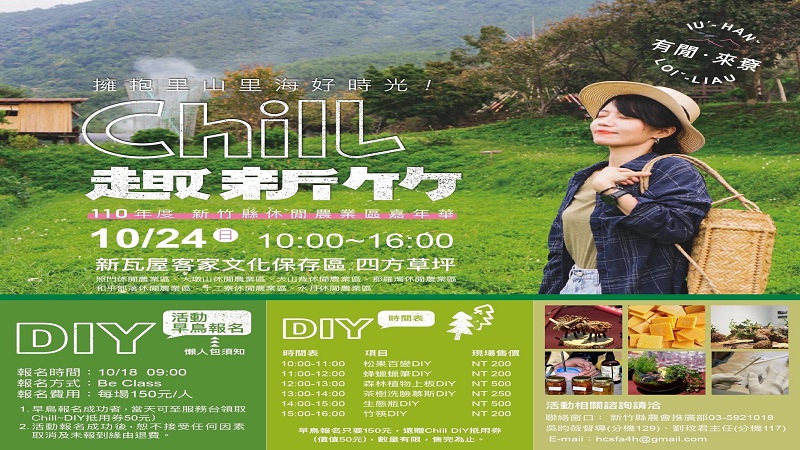 為鼓勵在地消費、推動國產米糧文化以及新竹縣七個休閒農業區旅遊特色,本府攜手新竹縣農會於本(110)年10月24日(星期日)在竹北市新瓦屋客家文化保存區舉辦「米穀好好玩」、「Chill趣新竹」行銷活動,除推廣國產米糧及新竹縣休閒農業區外,亦搭配休閒農場、果園、特色產業的農遊體驗,邀請民眾當令暢玩、支持在地農業。