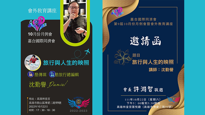 嘉合同濟會日前假高雄林皇宮舉辦第九屆10月月例會暨教育講座,由會長 許淵智主持,許會長交友廣闊,致力於統合行銷,並推動文學、藝術、文化、教育等相關事務。此次例會教育講座邀請到數創學院的執行長、酷傳媒與酷旅行的總編輯、並擔任文學獎評審的沈勤譽先生來為大家講授「旅行與人生的映證」。