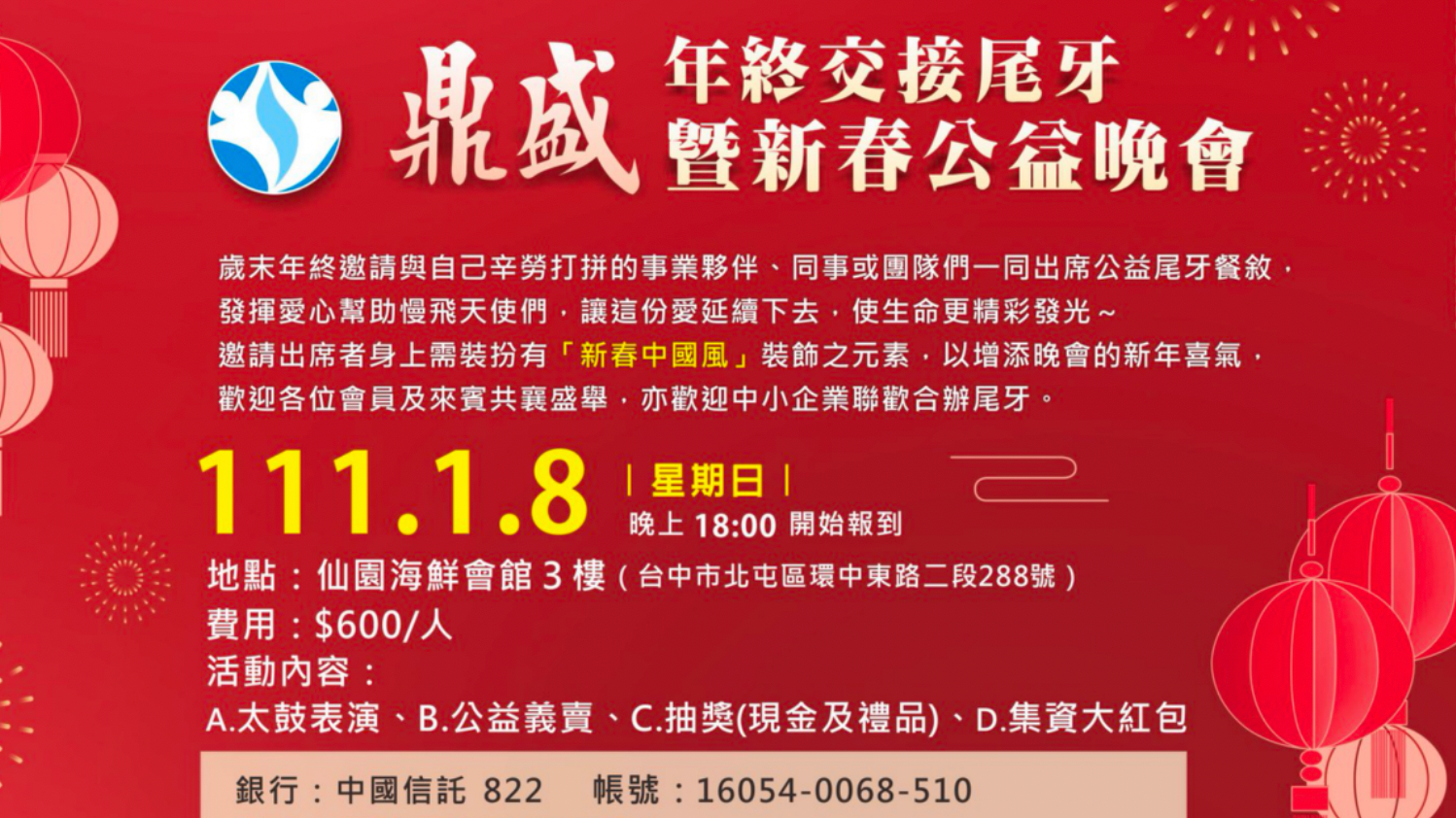 鼎盛中小企業聯誼會將於112年1月8日,在仙園海鮮會館3樓(台中市北屯區環中東路二段288號)舉辦年終交接尾牙暨公益義賣晚宴,以「新春中國風」為主題,邀您發揮創意,為新年添喜色!現場有太鼓表演、公益義賣、抽獎(現金及禮品)、集資大紅包等活動,歡迎各位會員與來賓共襄盛舉。
