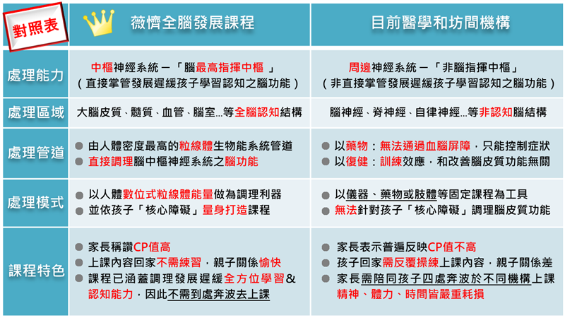 「薇懠超級《學習能力》開發中心」非醫療機構,不涉及任何醫療行為或使用醫療器材、藥物及針劑進行侵入式治療,完全符合衛福部規定。《薇懠》是以全方位的角度,針對發展遲緩及學習障礙的孩子,量身設計全腦課程,調理其大腦皮質之學習中樞,顛覆傳統復健式的繁複訓練,不需做額外的回家作業及練習,讓孩子在輕鬆愉快的環境中,便能激發智慧、創造改變一生的學習力!這項課程經常在短時間內,突破性的幫助孩子實質進步,並讓許多教育專家和家長嘖嘖稱奇。
