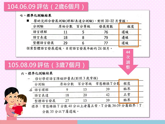上《薇懠》第一堂課後家長就看到了小雨的改變,12堂課後,媽媽說:進步速度超乎所期待,相較於傳統方式需上許多種課程費時費神,在《薇懠》可得到全方位進步,CP值頗高。一年後在睡眠、認知、語言、情緒、社會性發展…等皆有顯著進步,與一般同齡小孩差異不大,再次評估,各科醫師都說進步許多,已排除在自閉症範疇外。先上腦部調理的課程後再去上其他職能或語言課程,小寶貝比較能吸收,事半功倍。