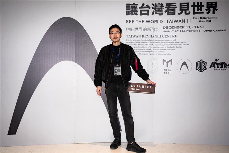 ▲18歲成為全台灣最年輕賽評(圖/胡翔閔提供)▲圖右台灣虛實整合MetaNext商業計畫團隊核心成員-胡翔閔(後方舉牌)