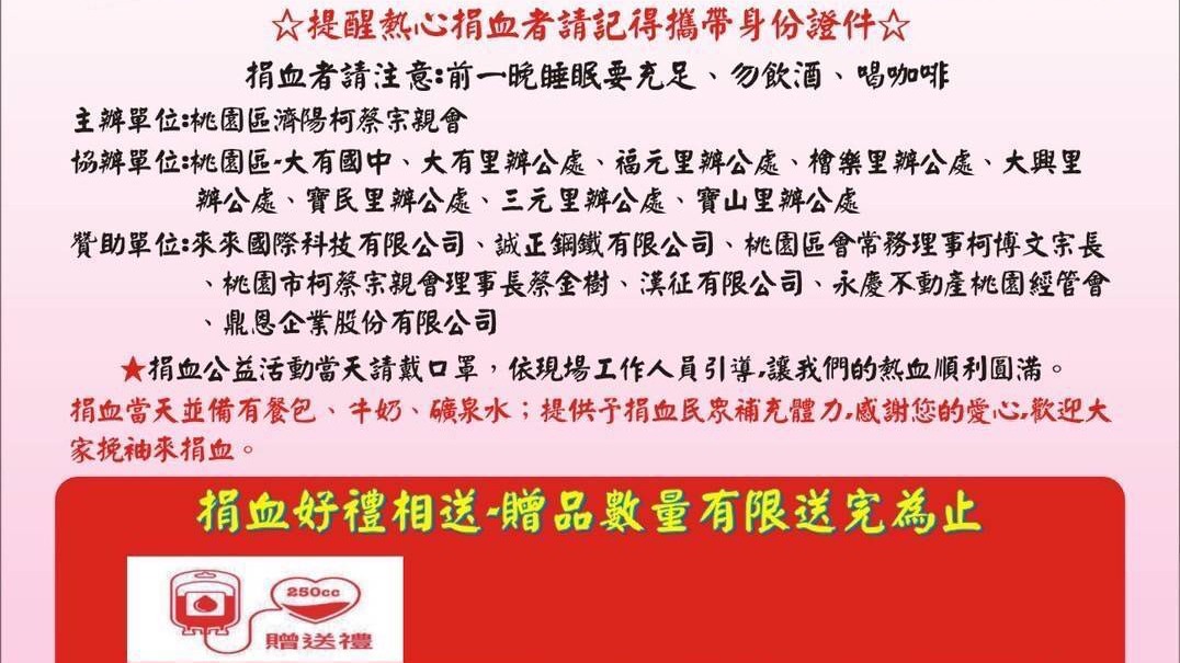 在桃園市桃園區的一個和風徐徐的夏日早晨,大有國民中學的校門前廣場上,一場特別的捐血活動正式展開。這場活動由桃園龍安警友站主辦、桃園區濟陽柯蔡宗親會承辦,並得到大有國中、陳美梅市議員辦公室、林政賢市議員辦公室、牛煦庭市議員辦公室大有里、三元里、福元里、寶山里、寶民里、檜樂里、大興里等地的辦公處共同協辦。在各位里長的熱情號召下,這場捐血活動受到了熱烈的迴響。