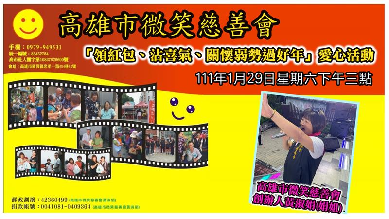 適逢年節將近「高雄市微笑慈善會」微笑(娟姐) ,再度發起「領紅包、沾喜氣、過好年愛心活動」,讓這些弱勢社會邊緣人,沾個福氣!喜氣洋洋好過年!屆時歡迎大家一起共襄盛舉!