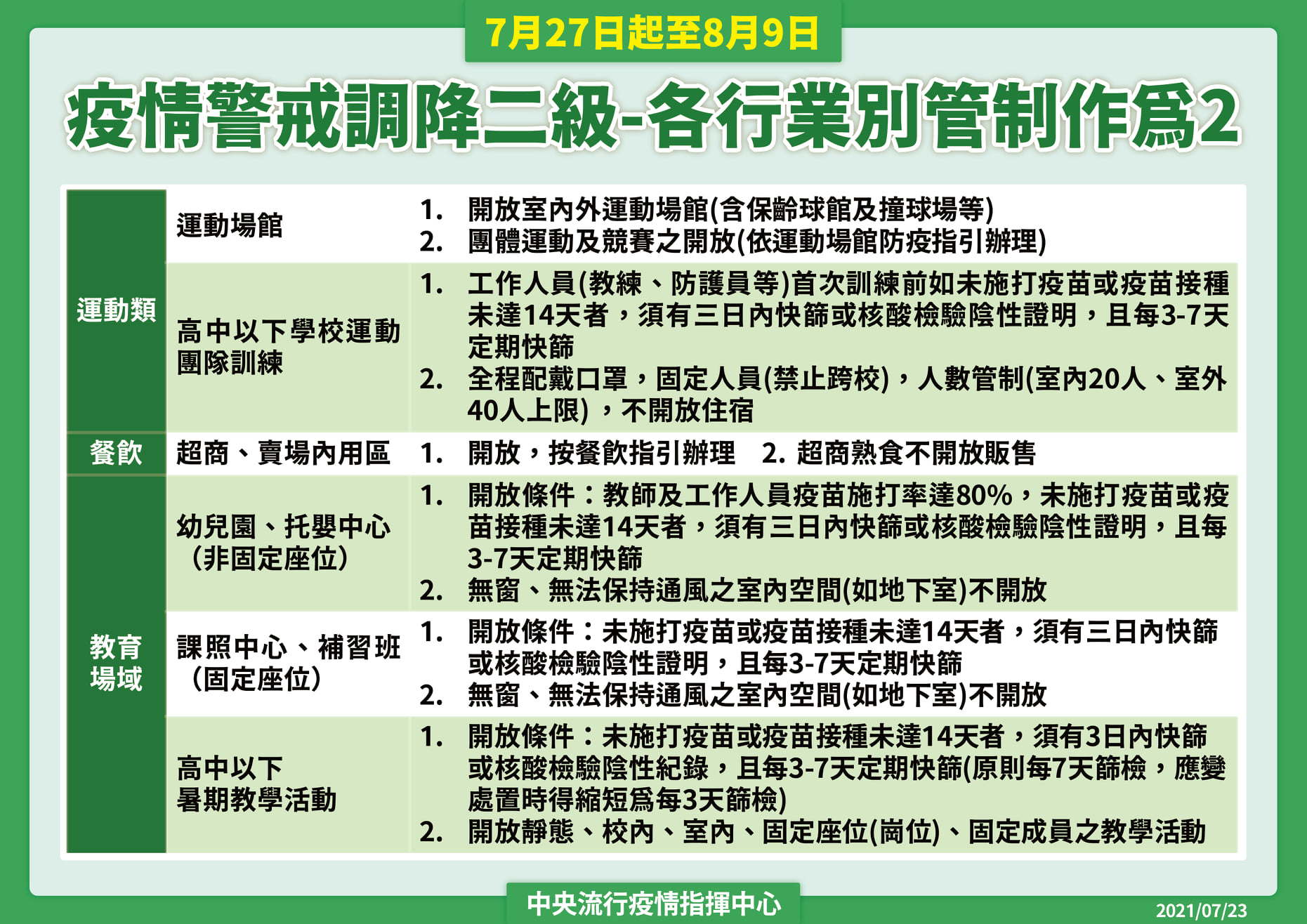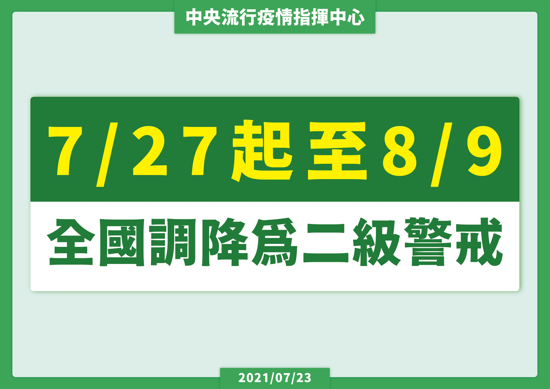 中央流行疫情指揮中心今(23)日表示,考量國內疫情及參酌其他國家之防疫調整經驗,並經與各地方政府進行溝通討論後,指揮中心自7月27日至8月9日調降疫情警戒標準至第二級,各部會得依指揮中心所發布之通案性原則另訂指引,而各地方政府亦得在此原則下,視疫情需要而有調整空間,惟相關指引必須規範明確以利民眾遵循。說明如下: