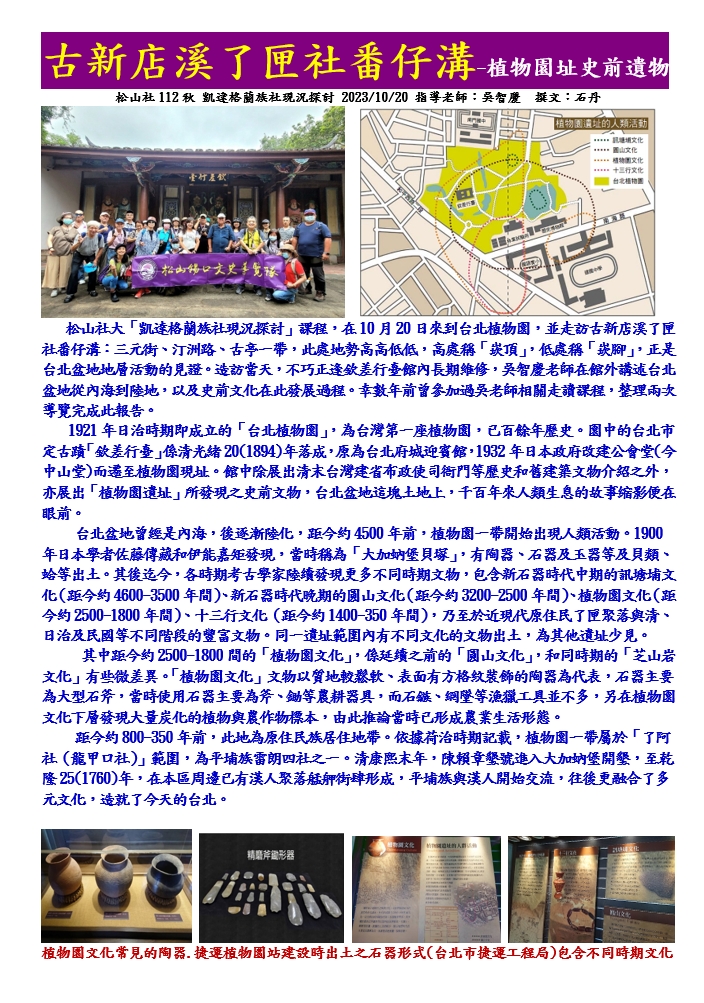 台北松山社區大學推動地方學-文史導覽培力課,由吳智慶教師特別規畫凱達格蘭族的前世今生主題系列探討,對文史導覽有興趣熱情學員,經由講授由戶外實地探訪導覽訓練,藉以了解地理環境、生態及人類生活歷史文化的脈動軌跡。這次以其中六社規劃設計深入導覽走讀,分別以每月一主題來探討,期許結合舉辦文史生態公益導覽,師生報導聯展,進而激發更多報導資料,導覽講解的行動能力。此以集結系列各成果摘要報導。