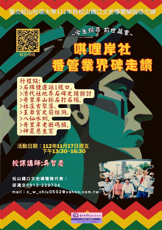 11/17週五下午13:30~16:30的凱達格蘭族系列三[ 唭哩岸社~番管業界碑走讀活動]我們將從石牌捷運站1號口出發,一起探討清代社地界石碑如何搬遷歷史留存至現今的石牌捷運站旁,一起欣賞奇里岸社打石場的前世今生,一起聆聽凱達格蘭族土地的故事-神農慈生宮。我們還將走訪社庄古聚落、王爺宮史前柱洞、八仙水圳、奇里岸老街碼頭等地,感受這裡的歷史風貌和現代變化。這是一次難得的機會,讓您深入了解台北的原住民文化和歷史變遷,不要錯過囉!