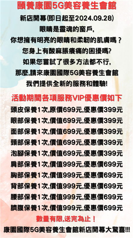 「頤養康園5G美容養生會館」開幕無疑是這一推廣計劃中的重要一環。會館提供一系列針對性強的保養服務,讓消費者在舒適的環境中享受專業的護理。為了慶祝開幕,自即日起至2024年9月30日推出系列體驗優惠活動,旨在讓消費者以優惠價格享受高品質的健康保養服務。活動期間,各項服務的體驗價如下:
