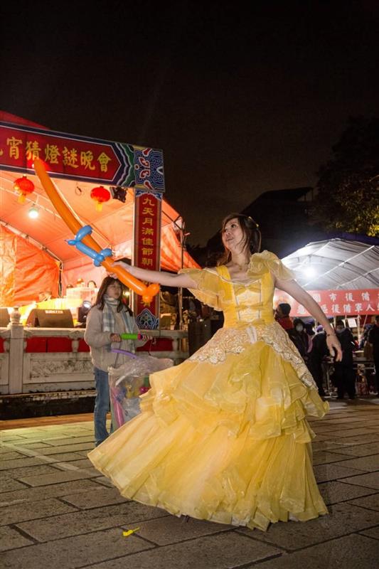 氣球姐姐身穿鮮豔的黃衣裳,她的臉上總是掛著溫暖且親切的笑容,隨著輕快的音樂起舞,她的手中不僅揮舞著氣球,還時不時展示著她那驚人的才藝~折氣球,隨著節奏,她輕巧地將色彩鮮艷的氣球編織、扭轉,不一會兒,各種可愛的動物氣球造型便應聲而出,有活潑的小狗、長頸的鹿、優雅的天鵝,甚至是兒童們著迷的恐龍,她的技藝不僅讓小朋友們驚喜連連,也讓在場的大朋友們讚嘆不已。每當一個氣球動物造型完成,氣球姐姐便會隨著音樂的節奏,輕快地走向聽眾,將這份手工藝品送到一名等待中小朋友的手中,孩子們的臉上瞬間綻放出純真無比的笑容,他們開心地擁抱著自己的氣球動物,眼裡充滿對這個世界的好奇和驚喜。