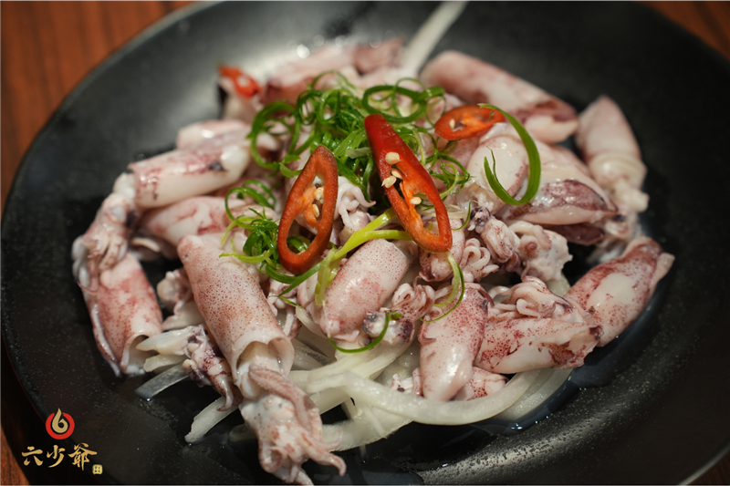 六少爺嚴選當日進港的新鮮小卷,肉質細緻、彈性十足。料理時僅以高溫滾水快速川燙,時間精準控制在數秒內,確保小卷熟而不老、嫩而不縮。