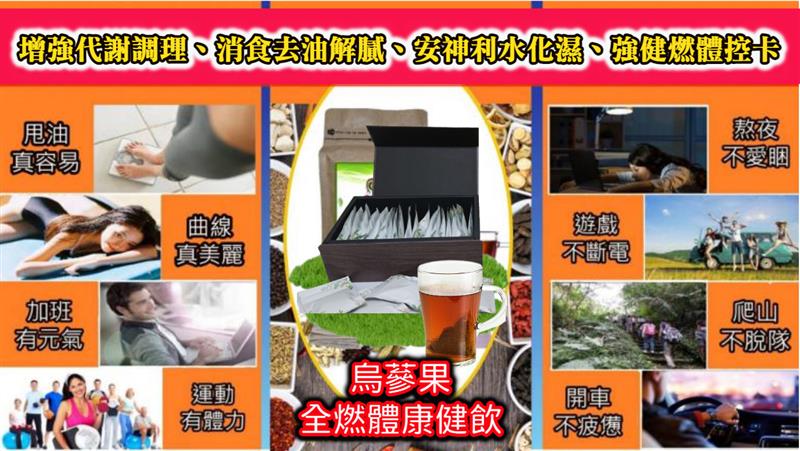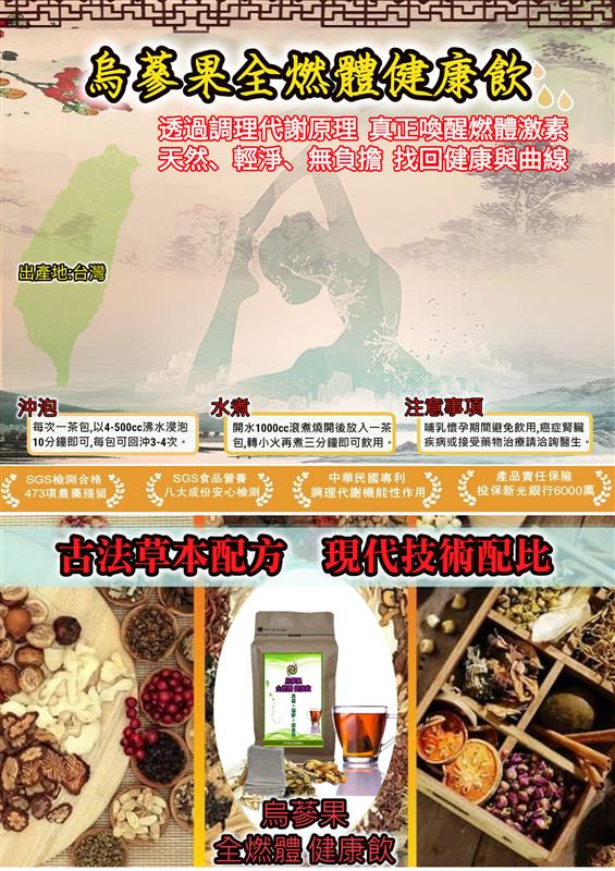 健康飲輔導顧問表示:烏蔘果全燃體健康飲採「古法草本配方,現代技術配比」打造出符合現代人體質的百分百草天然茶飲,一年四季皆適合飲用,只要注意飲食或運動,就能促進熱量轉換燃燒脂肪及提高身體代謝,公司未來會提供更多多元健康知識課程,傳遞健康減重的觀念與正確方式,讓大家達到體內環保、輕淨、健康控制體重的主要目的。