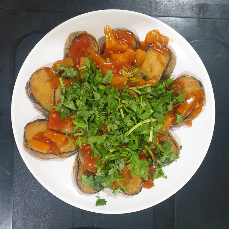 接著是素魚片,這道菜用豆腐和各種調味料製成,形狀和質地都和真正的魚片極為相似。我將它蘸上搭配的醬料後咬下去,豆腐柔軟和魚的鮮嫩味道在口中交織,仿佛吃到了真正的魚片。味道上絕對不輸給任何一道魚肉菜。