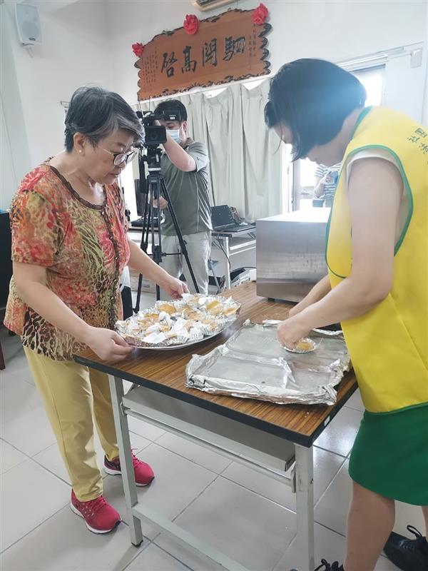 🔺鄭美芬與林涓琦老師幫里民DIY南瓜餅準備放進烤箱 (圖/協會提供)